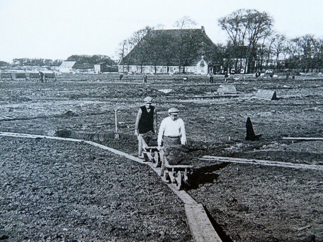 Aanleg vliegveld 1936, achtergrond boerderij Humalda